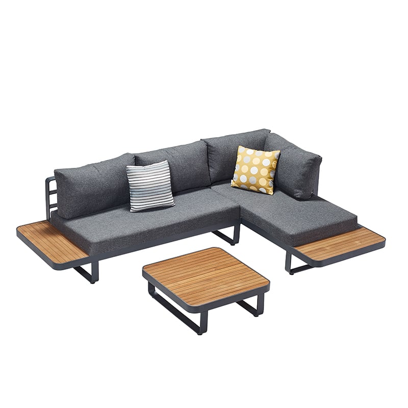 Deze stijlvolle hoeklounge bestaat uit een linker- en rechterbankelement en een stevige koffietafel. In het ontwerp van deze set zorgt gepoedercoat zwart aluminium voor een solide basis. Door de poedercoating is het frame krasvast en onderhoudsarm. Voor zowel de zijkanten van de lounge als voor het tafelblad is gekozen voor hoogwaardig teakhout in een lattenstructuur. De kussens zijn bekleed met grijs stoffering, welke gevuld zijn Quick Dry Foam. Hierdoor is de set perfect voor professioneel buitengebruik!