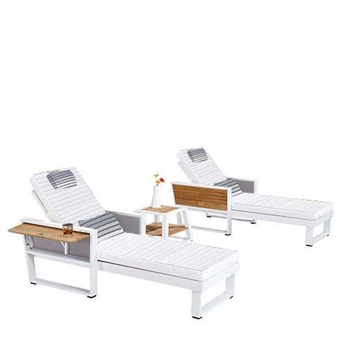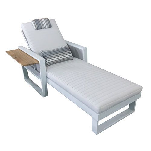 Het ligbed is voorzien van een stevig wit aluminium frame, stoere teakhouten elementen in de armleuningen, welke tevens uit te klappen zijn en heerlijke kussens gemaakt van Olefin. Olefin is een zeer sterk materiaal. Vuil en UV-straling hebben geen invloed op de kwaliteit, de kussens zijn slijtvast en voelen heerlijk zacht aan. Het ligbed is in verschillende standen verstelbaar.